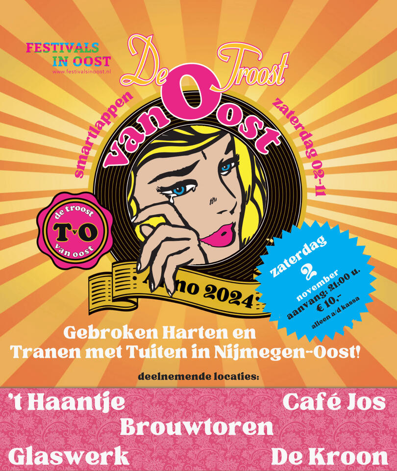 Het bekende smartlappenfestijn in Nijmegen-Oost vindt dit jaar plaats op zaterdag 2 november! De hele avond de leukste meezingers, tranentrekkers en inhakers. Een passe-partout voor alle vijf locaties kost 10 euro en is enkel op de avond zelf aan de deur verkrijgbaar.Deelnemende locaties: